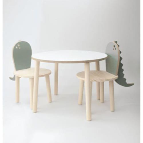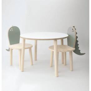 Kit composto de uma mesa redonda com tampo no mdf branco de 57 cm de diâmetro e pés de 45 cm de altura. Duas cadeiras modelo dinossauro com assento na madeira e pés na madeira com 25 cm de altura. Encosto no mdf.