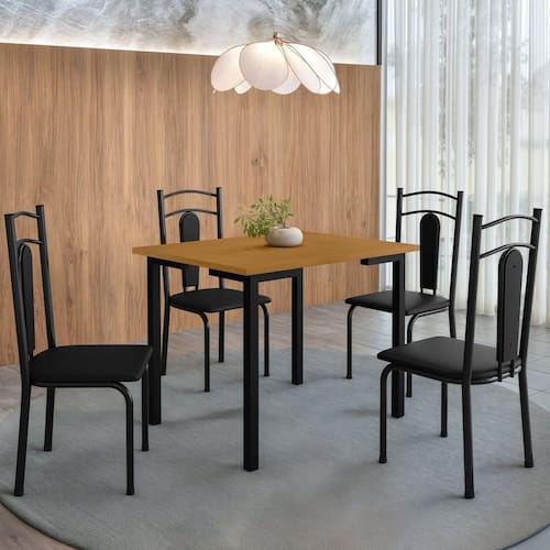 Sua estrutura é de tubo com pintura epóxi de alta resistência, tampo da mesa em MDP, o que proporciona um design moderno ao produto, cadeiras com assento confortável e encosto anatômico proporcionando conforto, o tecido é um Sintético, similar ao couro, de fácil limpeza. Medida da Mesa (A x L x P): 77cm x 109cm x 68cm Peso da Mesa: 11,97 kg Mesa suporta até: 20 kg Acabamento da Cadeira/Banco: Pintura Epóxi Acabamento da Mesa: Pintura Epóxi Almofada do assento: Fixa Ambiente Principal: Sala de Jantar Cadeira/Banco Estofada: Encosto e Assento Estofados Cadeira/Banco estofada: Encosto e Assento Estofados Cadeira/Banco suporta até: 100 kg codigo_ean: 7900288212757 Complexidade da Montagem: Média: pode ser montado por mais de uma pessoa e/ou necessite de maior conhecimento para montagem Cor: Preto / Marrom Cor do Produto: Preto / Marrom Cor Secundária: Cinza De Canto (Canto Alemão): Não Enchimento do Assento: Espuma D-12 Escala de Brilho: Semi-Fosco Espessura do Tampo: 15 mm Estrutura do Assento: Aço Formato do Tampo: Retangular Itens Inclusos: 1 Mesa, 4 Cadeiras, Kit Ferragens e Manual de Montagem Linha ou Coleção: Madri Manual de Montagem e Instalação: https://product-hub-prd.madeiramadeira.com.br/378087219/documents/5b2264bb-1711-4b54-9859-99755356af6d3134633531017551017109043.pdf Marca: Art Panta Material da Base da Mesa: Aço Material da Estrutura da Cadeira: Aço Material do Tampo: MDF/MDP Medida da Cadeira/Banco (A x L x P): 94cm x 37cm x 46cm Medida do Tampo (L x C x E): 109cm x 68cm x 15mm Mesa Dobrável: Não Mesa Extensível: Não Montagem Flex: Não Necessita Montagem: Sim Origem do Produto: Nacional Peso da Cadeira/Banco: 14,962 kg Possui Apoio para Braços: Não Possui Apoio Para os Pés: Não Possui Prateleiras: Não Possui Suporte Giratório: Não Quantidade de Cadeiras: 4 Quantidade de Lugares: 04 Recomendações de Uso, Manutenção e Limpeza: Pano levemente umedecido com água, seguido de pano seco, não utilizar produtos químicos ou abrasivos. Revestimento da Cadeira/Banco: Courino Sistema de Montagem: Parafusos