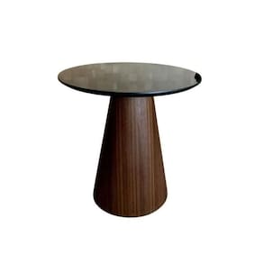 Mesa Lateral Cone ;Redonda, Tampo 51 cm em MDF ;Laca Preta, ;Base estruturada em MDF Flexivel e acabamento em Lamina de Madeira Natural Imbuia Rajado.