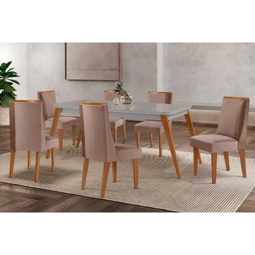 Sala de Jantar Completa Havana c/ Tampo Madeirado c/ Vidro Canto Curvo 180x90cm e 6 Cadeiras Tilia Madeira Maciça Naturale/Off White - Capuccino/Linho Capuccino - Rufato