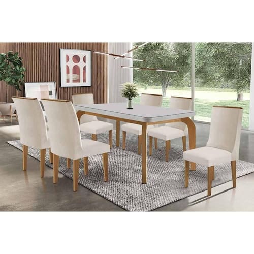 Mesa: MDF, Vidro temperado, Madeira. Cadeira: Madeira maciça, Suede.Vendido e entregue por Costa Rica Colchões