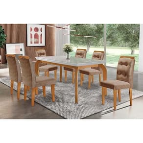 Abaixo segue os produtos do KIT: Sala de Jantar Completa Londrina c/ Tampo Madeirado c/ Vidro Canto Curvo 180x90cm e 6 cadeiras Imperatriz Imbuia/Off White - Suede Capuccino - Rufato