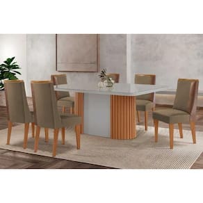 Sala de Jantar Completa Pilar c/ Tampo Madeirado c/ Vidro Canto Curvo 180x90cm e 6 Cadeiras Tilia Madeira Maciça Naturale/Off White - Capuccino/Suede Capuccino - Rufato Abaixo segue os produtos do KIT: Sala de Jantar Completa Pilar c/ Tampo Madeirado c/ Vidro Canto Curvo 180x90cm e 6 Cadeiras Tilia Madeira Maciça Naturale/Off White - Capuccino/Suede Capuccino - Rufato