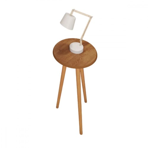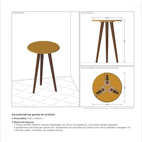 Características: - Tampo de MDF 15 mm com bordas usinadas arredondadas - Pés de Madeira Maciça - Acabamento dos pés: Verniz Poliuretano -PU- - Acabamento do tampo: Semi-Brilho - Suporte de peso: 8 kg - Garantia de 03 meses