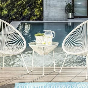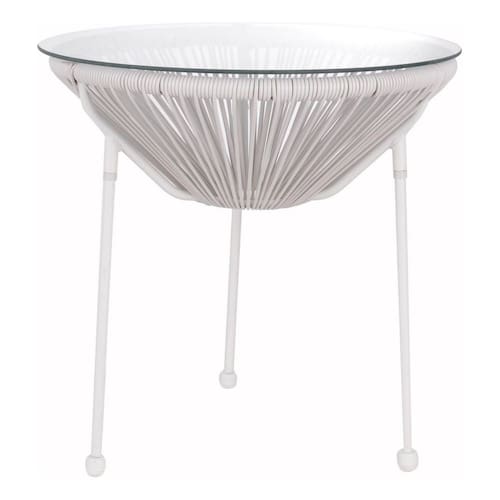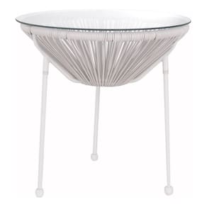 "Adicione um toque de elegancia ao seu espaco ao ar livre com a Mesa Cozumel de 50cm com Rattan Branco. Projetada com uma estrutura de aco robusta e duravel, esta mesa e perfeitamente adequada para suportar as condicoes externas. O tampo de vidro temperado proporciona uma superficie lisa e resistente para colocar suas bebidas, livros ou decoracoes favoritas. Com seu design redondo e acabamento branco, esta mesa ira se integrar perfeitamente a qualquer decoracao existente.