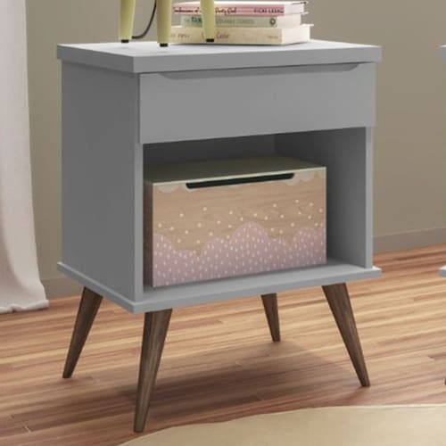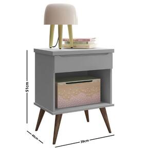 Características: Estrutura em MDF Acabamento em Pintura UV atóxica 1 Gaveta Corrediças telescópicas Puxador em Cava 4 Pés Pés em Eucalipto Gaveta suporta até 5kg