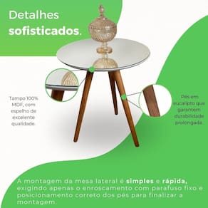 Essa mesa lateral une funcionalidade e sofisticação com seu tampo em MDF revestido com espelho, que adiciona brilho e modernidade ao design. Os pés em eucalipto, com acabamento natural, proporcionam um toque orgânico e acolhedor. Compacta e versátil, é perfeita para complementar diferentes ambientes, servindo como apoio para objetos decorativos ou itens do dia a dia. Uma peça que combina durabilidade e elegância de forma harmoniosa. Acabamento do Tampo: Laca Altura do Espelho: 45 cm Ambiente Principal: Sala de Estar Complexidade da Montagem: Baixa: pode ser montado por uma pessoa sozinha Cor: Branco / Mel Cor do Produto: Branco / Mel Escala de Brilho: Fosco Espessura do Espelho: 3 mm Espessura do Tampo: 15 mm Extensível: Não Formato do Espelho: Redondo Itens Inclusos: 1 Mesa de canto lateral e 1 Kit com 3 pés palitos de Eucalipto. Largura do Espelho: 45 cm Linha ou Coleção: Athenas Manual de Montagem e Instalação: https://product-hub-prd.madeiramadeira.com.br/971566/documents/623b1cb5-fc41-4279-89f2-e02e23aeb055montagemmesalateralathenas.pdf Marca: Sparta Móveis Material do Tampo: MDF Material Principal: MDF Medida do Tampo (L x C x E): 45cmx45cmx1,5cm Necessita Montagem: Sim Origem do Produto: Nacional Peso: 6 kg Possui Base: Não Possui Espelho: 01 Possui Gavetas: Não Possui Portas: Não Possui Prateleiras: Não Possui Suporte Giratório: Não Recomendações de Uso, Manutenção e Limpeza: Limpar com pano seco e limpo Sistema de Montagem: Não é necessário nenhum material para a montagem. Basta enroscar os pés no tampo. Suporta Até (kg): 15 kg Tipo de Fixação do Espelho: Silicone Marca: Sparta Móveis