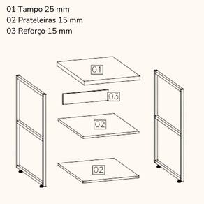 Materiais: Estrutura em MDP (tampo 25mm/ reforço e prateleiras 15mm) e base em Metal.
