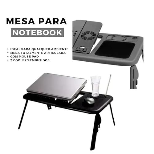 Características: Totalmente Portátil e Dobrável Material Resistente 2 Coolers de refrigeração instalados Equipado com Mouse Pad Equipado com tiras antiderrapante Material: Plástico Injetado ABS Dimensões A x L x C : 31 x 25 x 56 Elevação Máxima: 40º