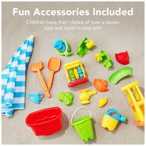 Este conjunto de brinquedos ao ar livre é perfeito para crianças de 3 a 7 anos que desejam aproveitar um dia de praia em casa. Com um design 2 em 1 e cores brilhantes, as crianças serão facilmente envolvidas durante horas de diversão. O conjunto vem com 18 acessórios, incluindo duas bacias distintas para separar a água da areia, permitindo que as crianças brinquem com uma variedade de brinquedos na água, como uma torre de água com vários baldes, rodas e escorregadores. Além disso, ferramentas de construção de areia, como baldes e moldes, permitem que as crianças se divirtam em uma competição de castelo de areia em seu próprio quintal. O guarda chuva ajustável incluído permite que as crianças brinquem na sombra, mesmo enquanto crescem. As dimensões gerais do conjunto são 68,58 cm x 73,66 cm x 43,18 cm e a capacidade de peso é de 54,42 quilos.