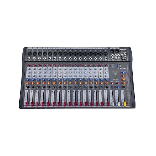 Além disso, este mixer é equipado com alimentação fantasma +48v para microfones condensadores, lâmpada de nível, indicador de monitoramento e potência, botão de volume de saída auxiliar e comutador auxiliar.