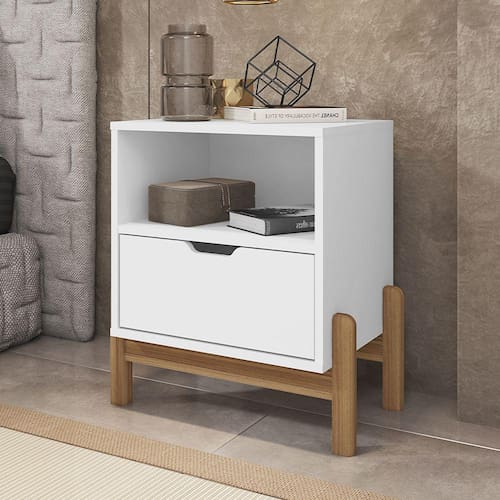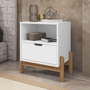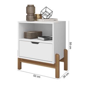 Características: Estrutura em MDF/MDP Pintura com acabamento Print Wood Atóxico Bordas com acabamento Soft PU 01 Gaveta com corrediças telescópicas e frente usinada Nicho com amplo espaço Pés de madeira