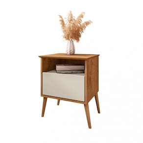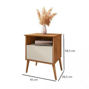 A Mesa de Cabeceira Cancun é ideal para você! Com design que mescla o moderno com o retrô de seus pés palito em madeira maciça -pinus-, ele conta com tampo de MDF chanfrado em ângulo, amplo nicho e gaveta com corrediças telescópicas.