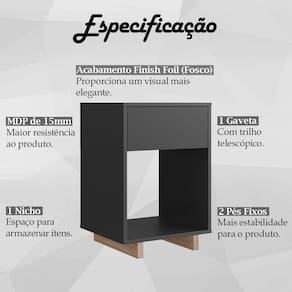 Mesa de Cabeceira Com Gaveta B88, uma peça moderna e versátil, ideal para deixar seu ambiente moderno e cheio de personalidade. Estrutura produzida em MDP de 15mm, contando com acabamento Finish Foil (Fosco), proporcionando maior durabilidade e resistência a peça. Composto por 1 Gaveta com trilho telescópico, 1 Nicho com amplo espaço, ideal para armazenar itens e 2 pés fixos em MDP, deixando o produto com maior estabilidade. Suportando até 20 kg o tampo, 5kg a gaveta e 5kg o nicho. Excelente para ter seus itens ao alcance, oferecendo mais praticidade em suas horas de descanso. Este móvel chegará na sua casa em 1 volume.
