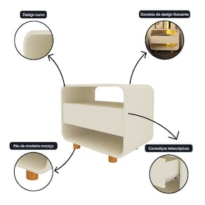 A mesa de cabeceira Innova é excelente para realçar a decoração do seu quarto. Seu design curvo destaca aconchego, modernidade e praticidade ao ambiente. Possui pés em madeira maciça, tornando-a ainda mais resistente. Além de uma excepcional abertura e fechamento da gaveta, por conta de seu mecanismo telescópico, que garante deslizamento suave e uniforme.