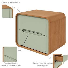 Características: Estrutura em 100 MDF Cantos arredondados em 15mm em todas as quinas do produto Puxadores com cava e acabamento P.U. 2 Gavetas com corrediças telescópicas Fundo das gavetas e costas em HDF