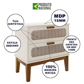 AS IMAGENS SÃO MERAMENTE ILUSTRATIVAS E PODEM SOFRER VARIAÇÕES DE COR E PEQUENOS DETALHES DE ACORDO COM O SEU MONITOR, ILUMINAÇÃO DO AMBIENTE E ATÉ MESMO A SUA PERCEPÇÃO VISUAL.Mesa De Cabeceira 2 Gavetas Santorini Off White 60 Cm Com Tela Indiana