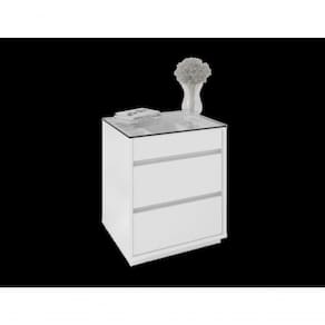 O Criado Belize é ideal para o seu quarto! Ele possui 3 gavetas sendo que a superior possui um organizador interno para joias, relógios, etc, feito em MDF. As gavetas possuem corrediças telescópicas. Tampo feito de vidro, base e laterais feitos em MDP de 25mm, e possui 3 travessas transversais em MDP de 15mm que garante maior estabilidade e resistência à estrutura.