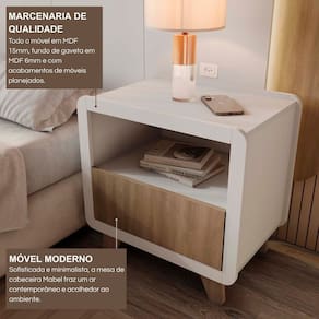 A Mesa de Cabeceira Mabel é a escolha ideal para quem busca elegância, funcionalidade e qualidade com o mesmo padrão dos móveis planejados. Produzida em 100% MDF com revestimento BP e acabamento em fita de borda PVC 0,045cm, garante durabilidade, resistência e acabamento sofisticado. Com 1 gaveta espaçosa e 1 nicho aberto, é perfeita para organizar livros, objetos pessoais e apoiar luminárias ou itens decorativos. Seu design moderno com pés robustos traz leveza e versatilidade, combinando facilmente com cabeceiras, camas e guarda-roupas em diferentes estilos. Com 55 cm de altura e 38 cm de profundidade, oferece praticidade no dia a dia sem abrir mão da beleza. Acabamento da Gaveta: Melamínico Acabamento dos Pés: Melamínico Altura dos Pés: 11,5 cm Ambiente Principal: Quarto Complexidade da Montagem: Média: pode ser montado por mais de uma pessoa e/ou necessite de maior conhecimento para montagem Cor: Branco/ Louro Freijó Grann Cor do Produto: Branco/ Louro Freijó Grann Cor Flex: Não Cor Interna: Branco Escala de Brilho: Fosco Escala de Brilho da Gaveta: Fosco Gaveta com Chave: Não Informações Complementares: Limpar somente com um pano levemente umedecido. Indicado para ambientes internos. Itens Inclusos: 1 Mesa de Cabeceira, Kit Ferragens e Manual de Montagem Linha ou Coleção: Mabel Manual de Montagem e Instalação: https://product-hub-prd.madeiramadeira.com.br/164036151/documents/c4cee90c-96f8-4be2-a240-94f17e75a2443105423657817538765459999.pdf Marca: FD Material da Gaveta: MDF Material dos Pés: MDF Material Principal: MDF Montagem Flex: Não Necessita Montagem: Sim Origem do Produto: Nacional Pés Reguláveis: Não Peso: 15 kg Peso Máximo por Gaveta: 5 kg Pet Friendly: Não Possui Espelho: Não Possui Possui Nichos: 01 Possui Pés: 04 Possui Portas: Não Possui Prateleiras: Não Possui Vidro: Não Quantidade de Nichos: 01 Recomendações de Uso, Manutenção e Limpeza: Limpar somente com um pano levemente umedecido. Indicado para ambientes internos Sapatas Niveladoras: Não Sistema de Montagem: Parafusos, cavilhas e minifix Suporta Até (kg): 5 kg Tipo de Corrediça da Gaveta: Metálica Telescópica Tipo de Puxador da Gaveta: Embutido