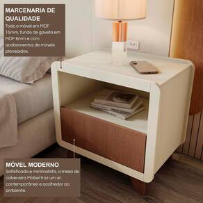 A Mesa de Cabeceira Mabel é a escolha ideal para quem busca elegância, funcionalidade e qualidade com o mesmo padrão dos móveis planejados. Produzida em 100% MDF com revestimento BP e acabamento em fita de borda PVC 0,045cm, garante durabilidade, resistência e acabamento sofisticado. Com 1 gaveta espaçosa e 1 nicho aberto, é perfeita para organizar livros, objetos pessoais e apoiar luminárias ou itens decorativos. Seu design moderno com pés robustos traz leveza e versatilidade, combinando facilmente com cabeceiras, camas e guarda-roupas em diferentes estilos. Com 55 cm de altura e 38 cm de profundidade, oferece praticidade no dia a dia sem abrir mão da beleza. Acabamento da Gaveta: Melamínico Acabamento dos Pés: Melamínico Altura dos Pés: 11,5 cm Ambiente Principal: Quarto Complexidade da Montagem: Média: pode ser montado por mais de uma pessoa e/ou necessite de maior conhecimento para montagem Cor: Off White / Castanho Cor do Produto: Off White / Castanho Cor Flex: Não Cor Interna: Branco Escala de Brilho: Fosco Escala de Brilho da Gaveta: Fosco Gaveta com Chave: Não Informações Complementares: Limpar somente com um pano levemente umedecido. Indicado para ambientes internos. Itens Inclusos: 1 Mesa de Cabeceira, Kit Ferragens e Manual de Montagem Linha ou Coleção: Mabel Manual de Montagem e Instalação: https://product-hub-prd.madeiramadeira.com.br/645891757/documents/d43fed08-bf04-47d3-b206-1c6dbbaad2453105423657817538765459999.pdf Marca: FD Material da Gaveta: MDF Material dos Pés: MDF Material Principal: MDF Montagem Flex: Não Necessita Montagem: Sim Origem do Produto: Nacional Pés Reguláveis: Não Peso: 15 kg Peso Máximo por Gaveta: 5 kg Pet Friendly: Não Possui Espelho: Não Possui Possui Nichos: 01 Possui Pés: 04 Possui Portas: Não Possui Prateleiras: Não Possui Vidro: Não Quantidade de Nichos: 01 Recomendações de Uso, Manutenção e Limpeza: Limpar somente com um pano levemente umedecido. Indicado para ambientes internos Sapatas Niveladoras: Não Sistema de Montagem: Parafusos, cavilhas e minifix Suporta Até (kg): 5 kg Tipo de Corrediça da Gaveta: Metálica Telescópica Tipo de Puxador da Gaveta: Embutido