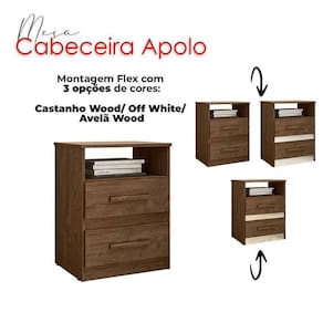 Começou a montar seu quarto? Então apresentamos para você esta bela mesa de cabeceira da linha Apolo. Com um nicho e duas gavetas com corrediças metálicas, garantindo um deslizamento mais suave, proporciona um amplo espaço interno para acomodar seus itens ou acessórios. Os puxadores em MDF trazem um toque de elegância. O diferencial é a sua opção de cores na hora da montagem, escolha entre três combinações: castanho wood/ off white/ avelã wood. Fabricado pela Moval, é desenvolvido em MDP de qualidade, sendo a escolha perfeita para quem busca design moderno, beleza e praticidade para compor seu quarto, aproveitem!