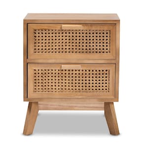 Baxton Studio Baden Mid-Century Mesa de canto moderna de madeira com acabamento marrom nogueira 2 gavetas com vime