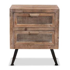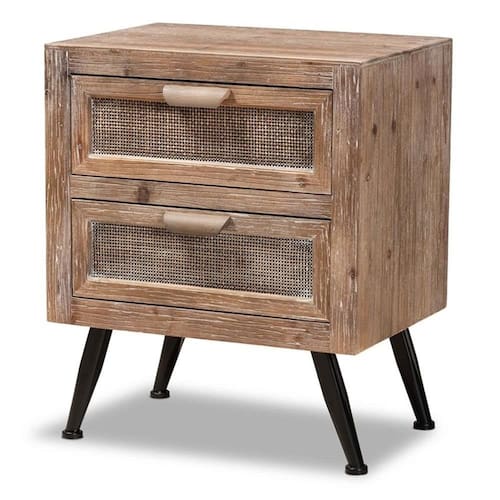 Destaque seu espaço com o estilo retrô da mesa de cabeceira Calida. Feita na China, esta mesa de cabeceira de madeira apresenta um acabamento marrom natural caiado de branco para um visual vintage. A mesa retangular oferece espaço para exibir decorações, enquanto duas gavetas oferecem amplo espaço de armazenamento. Cada gaveta é equipada com uma alça de madeira lisa e curva para facilitar o acesso. Exigindo montagem, a mesa de cabeceira é equipada com gavetas de vime trançado e pernas anguladas para dar um toque de charme de meados do século. Uma peça útil que irradia um caráter forte, a mesa de cabeceira Calida certamente ajudará a organizar qualquer espaço.
