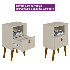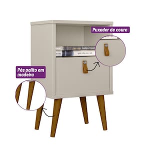 A Mesa de Cabeceira Búzios é ideal para compor o dormitório e ser posicionada ao lado da cama, oferecendo um bom espaço no tampo e em seu nicho para dispor objetos de uso diário e também decorações. Conta ainda com pés torneados, uma gaveta com corrediças telescópicas e um puxador de couro sintético que deixa o seu ambiente ainda mais moderno e harmonioso.