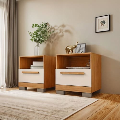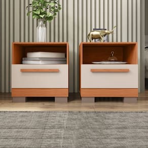 Funcional e estilosa, a mesa de cabeceira apresenta uma capacidade de peso de 15 Kg, distribuidos uniformemente, e vem sem rodas, proporcionando estabilidade e firmeza. Possui uma gaveta com capacidade para ate 5 Kg, feita de madeira MDP na cor off white. Esta gaveta, com altura de 14,6 cm, largura de 38,6 cm e espessura de 1,2 cm, nao possui freio, mas conta com um fechamento comum. Alem disso, o produto vem com 2 puxadores externos em madeira na cor freijo, facilitando o manuseio.