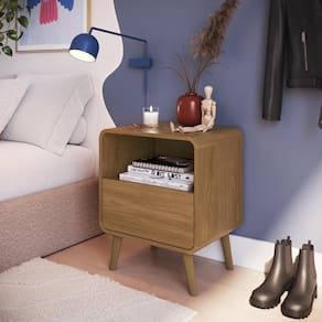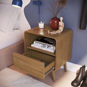A Mesa de Cabeceira Canto Curvo com Nicho 01 Gaveta e Pés Palito Retrô da Completa Móveis apresenta funcionalidade, praticidade e elegância com design arrojado e atemporal! Com cantos arredondados, traz uma leveza ao ambiente.