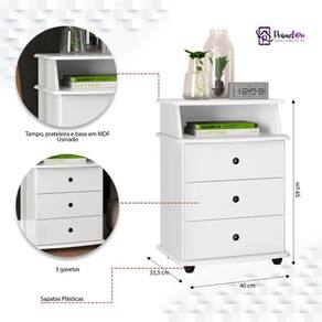 A Mesa de Cabeceira Luxo irá agregar muito mais charme e praticidade para organização do seu quarto! Com ele terá muito espaço para deixar seus pertences bem aonde precisa para alcança-los. Fabricado em MDP 12mm e pintura UV, Tampos ergonômicos, 3 gavetas, 01 Nicho e Pés em plástico resistente com anti umidade. Produto pratico e moderno atendendo exatamente suas necessidades!!!