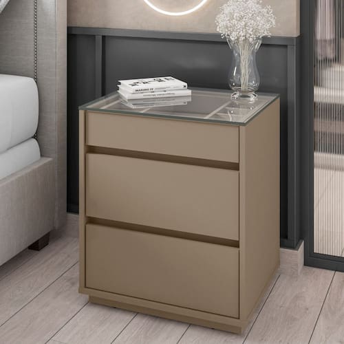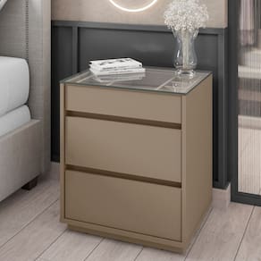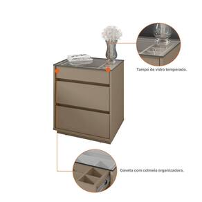 Mesa de Cabeceira com Tampo de Vidro 3 Gavetas Belize Casa D, e ideal para o seu quarto! Ela possui 3 gavetas sendo que a superior possui um organizador interno. As gavetas possuem corredicas telescopicas. Tampo feito de vidro, base e laterais feitos em MDP. Sua pintura conta com acabamento Print Wood.
