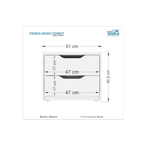Este produto é o que há de moderno, Mesa de Cabeceira 02 Gav. Conect ? Santos Andirá - fofo e multifuncional. Ele possui 02 gavetas com corrediças telescópicas e desliza sobre rodízios embutidos, podendo ser utilizado em vários ambientes diferentes como quartos infantis/juvenis, sala, etc. Ele também se encaixa perfeitamente opcional em baixo da cama Conect 02 gavetas. Formando um móvel completo! Seu tampo é em 25 mm, proporcionando aquela robustez ao produto. Características- Revestimento ? Pintura UV - Tinta Branca e aplicação de Esmalte Brilhante - Matéria Prima ?100% MDF 25 e 15-mm- Fundo Traseiro ? HDF 003-mm- Tampo superior e laterais 25-mm- Gavetas ? 02 Gavetas com corrediças Telescópicas- Puxador ? usinado nas Gavetas para abertura e fechamento- Montagem ? Girofix ? Cavilhas e Pregos- Acessórios ? 04 rodízios- Embalagem ? Papelão Onda Simples Parda (Papel Kraft com Miolo) revestido com plástico termoencolhível. Informações técnicas- Alt-42,5-Cm- Larg-51,0-Cm- Prof-41,0-Cm- Peso Bruto-15,60-Kg- Acompanha Kit Ferragens e Esquema de Montagem- Este Produto é vendido desmontado e embalado em 01 Volume - Não é Necessário Parafusar na Parede. Limpeza- Não limpar com álcool ou qualquer outro produto químico, utilize somente pano seco ou levemente umedecido. Garantia- 03 Meses (Contra defeitos de Fabricação) Observações- As dimensões estão expressas na seguinte forma ? Altura x Largura e Profundidade em Cm - aconselhamos a montagem ser feita por um profissional - as imagens indicam uma sugestão de uso e são apenas ilustrativas, - Os objetos decorativos não estão inclusos,