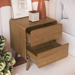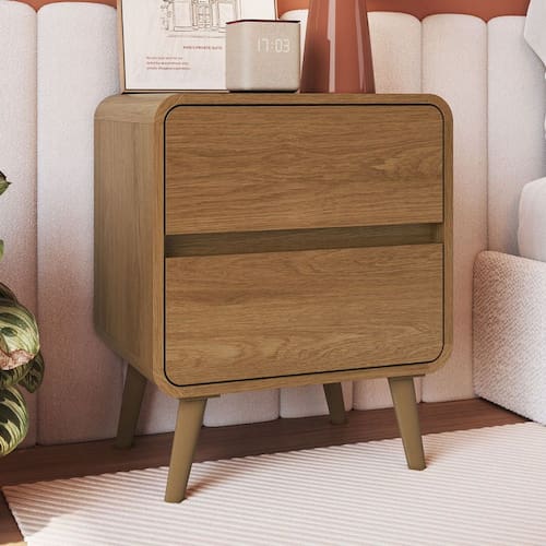 O(a) Mesa de Cabeceira Curve 2 Gavetas Carvalho Xingu - Completa Industria é produzido em MDP na escala de brilho Fosco, e possui um grau de dificuldade de montagem: Fácil.
