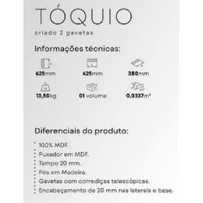 Mesa de Cabeceira Tóquio  -Móveis FênixMedidas do produto:Largura: 0,42.5 cmProfundidade: 0,38 cmAltura: 0,62.5 cmPeso: 13,5 KgVolumes: 1