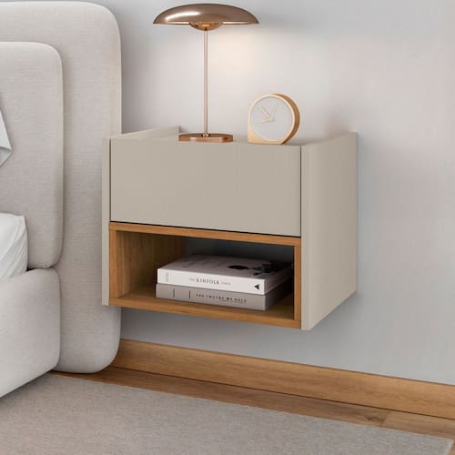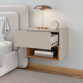 O(a) Mesa de Cabeceira Florença 1 Gaveta Off White/Cedro - Casa D é produzido em MDF e MDP na escala de brilho Semi-Fosco, e possui um grau de dificuldade de montagem: Médio.