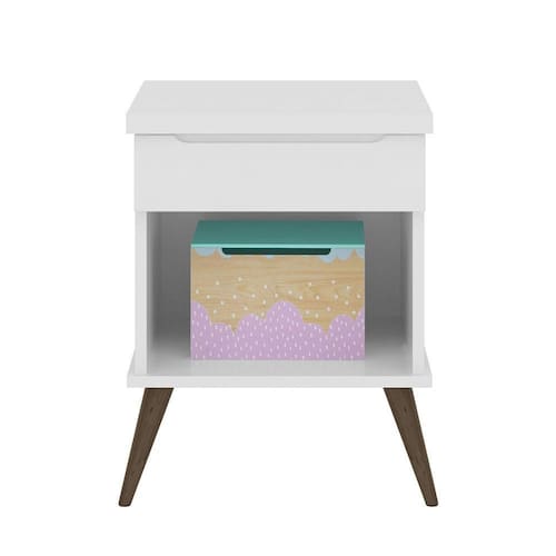 Com a Mesa de Cabeceira Infantil com 1 Gaveta Melinda Branco, da Phoenix Baby, você tem a garantia de estar adquirindo um produto de qualidade, pois é fabricada 100% em MDF de 15mm, ou seja, muito resistente e duradoura. Além da sua funcionalidade, já que é composta por 1 gaveta e 1 nicho que deixam tudo organizado e no lugar, ainda complementa a decoração do quarto, pois os pés palito estilo retrô são um charme a parte e criam um ar vintage ao passo que o design com linhas retas e puxadores modelo cava agregam modernidade.