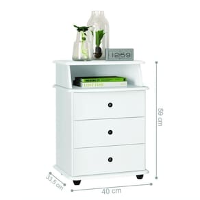 A Mesa de Cabeceiracontém 3 gavetas, nicho e tampos ergonômicos.