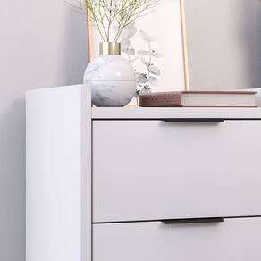 Além disso, a Mesa de Cabeceira Pés Palito Toni possui acabamento em branco com brilho, que traz elegância ao ambiente. Os puxadores em metal preto complementam o visual moderno do móvel.