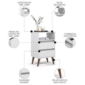 Com pés retrô, essa mesa de apoio traz um charme vintage que combina perfeitamente com qualquer estilo de decoração. Seja em um quarto clássico ou contemporâneo, os pés palito adicionam um toque de personalidade e estilo único, tornando essa peça um verdadeiro destaque. Além disso, as duas gavetas espaçosas são perfeitas para armazenar seus pertences pessoais de forma organizada e discreta, enquanto o puxador passante dá um toque minimalista ao design e o nicho completa a funcionalidade.