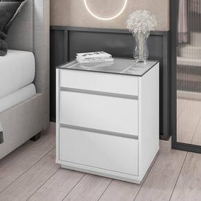 Material da mesa de cabeceira: MDP de 25mm e 15mm com tampo de vidro 8mm;