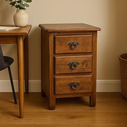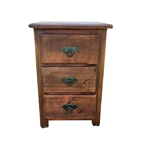 Adicione charme e funcionalidade ao seu ambiente com esta mesa de cabeceira rústica em madeira maciça. Com acabamento natural e detalhes em metal nos puxadores, a peça oferece três gavetas espaçosas para organização de objetos pessoais. Ideal para quartos ou escritórios com estilo rústico ou retrô.
