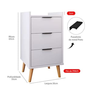 Mesa Cabeceira Pés Palito Ape 3 Gavetas Cor Branco A Mesa Cabeceira Pés Palito Ape 3 Gavetas é o produto perfeito para complementar a decoração do seu quarto com estilo retrô. Com três gavetas corrediças e pés palito de madeira maciça pinus, essa mesa de cabeceira oferece funcionalidade e charme ao seu espaço. As dimensões do produto montado são: altura de 0,63 cm, largura de 0,30 cm e profundidade de 0,35 cm. Possui acabamento em branco com brilho, que traz um toque de elegância ao ambiente. Os puxadores em metal preto complementam o design moderno e sofisticado dessa mesa de cabeceira. A montagem do produto é fácil e acompanha um kit de montagem e manual de instrução detalhando passo a passo como montar. É importante ressaltar que a montagem deve ser feita por um profissional, para garantir que o produto não seja danificado. Essa mesa de cabeceira é exclusiva e possui um design único, que certamente será um destaque no seu quarto. Além disso, é embalada com uma caixa reforçada nas laterais para garantir que não ocorra no transporte. Com a Mesa Cabeceira Pés Palito Ape 3 Gavetas, você terá um móvel funcional e estiloso para armazenar seus objetos pessoais, como livros, óculos, celular, entre outros. Além disso, ela também pode servir como um apoio para objetos decorativos, como porta-retratos, vasos de flores, luminárias, entre outros. Não perca a oportunidade de adquirir a Mesa Cabeceira Pés Palito Ape 3 Gavetas Cor Branco e deixar o seu quarto ainda mais bonito e organizado