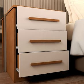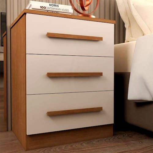 O(a) Mesa de Cabeceira Tulum com 3 Gavetas Cinamomo/Off White - Loja é produzido em MDP na escala de brilho Fosco, e possui um grau de dificuldade de montagem: Médio.