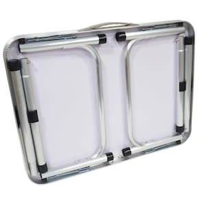 Uma mesa super prática e fácil de montar e desmontar em qualquer lugar, sendo facilmente transportada no Carro ou até mesmo a pé, pesando apenas 2,5 Kg. Mesa em cor Branco e Cinza mesclado na tampa e estrutura em Alumínio, com duas alturas podendo ser usada em vários ambientes ou ocasiões conforme a necessidade para o uso, super versátil e prática, resistente e alta durabilidade, sendo um ótimo investimento de custo-benefício.