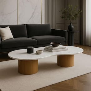 Observação: Inspirada na leveza das formas orgânicas, a Mesa de Centro Aura combina o calor do Freijó com a pureza do Mármore Branco Extra, criando uma presença suave e elegante em qualquer ambiente.