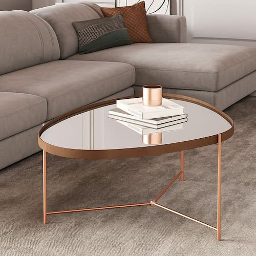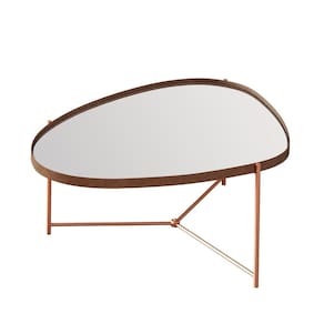 A mesa de centro orgânica alamanda contém a borda em couro sintético com 0,4 cm de altura, espelho e pés em ferro na cor bronze.