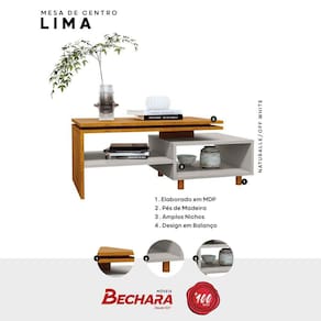 Mesa de centro Lima é a mesa decorativa que falta em sua sala! Com design moderno, com tampos duplos em balanço, ela irá agregar muito mais charme e requinta para sua casa. Elaborado em MDP com pés de madeira maciça (Pinus), o que garante maior resistência e qualidade. Produto Montado: Sim Acabamento: Pintura Texturizada UV Acabamento do Tampo: Pintura UV Ambiente Principal: Sala de Estar codigo_ean: 7909903624081 Complexidade da Montagem: Baixa: pode ser montado por uma pessoa sozinha Cor: Naturalle/Off-White Cor do Produto: Naturalle/Off-White Dobrável: Não Escala de Brilho: Semi-Brilho Espessura do Tampo: 15 mm Extensível: Não Formato da Mesa: Retangular Informações Complementares: Elaborada em MDP 15mm e 12mm. Pés de Madeira Maciça (Pinus). Itens Inclusos: 01 –Mesa de Centro Lima ; 01 - Manual de Montagem Detalhado Linha ou Coleção: Lima Manual de Especificação Técnica: https://product-hub-prd.madeiramadeira.com.br/900350/documents/a06372d2-1465-4ddb-bf44-2a84776c87cadecentrolimafolhetotecnico.pdf Manual de Montagem e Instalação: https://product-hub-prd.madeiramadeira.com.br/900350/documents/1dd39a57-76fb-4cb2-a112-2794daacc169trolimamanualmontagemed001.pdf Material da Prateleira: MDP Material do Tampo: MDP Material Principal: MDP Medida do Tampo (L x C x E): 45 cm x 72 cmc x 1,5 cm Necessita Montagem: Sim Origem do Produto: Nacional Peso: 13,3 kg Peso Máximo por Prateleira: 2 kg Possui Base: Não Possui Gavetas: Não Possui Portas: Não Possui Prateleiras: Sim Possui Suporte Giratório: Não Quantidade de Nichos: 02 Quantidade de Prateleiras: 01 Prateleira Recomendações de Uso, Manutenção e Limpeza: Recomenda-se limpar o produto com flanela ou pano macio seco, não utilizar produtos abrasivos, desengordurantes, álcool ou solvente. Mantê-lo em lugar livre de umidade e/ou exposição direta ao sol. Resistente à Chuva: Não Sistema de Montagem: Parafusos, Minifix, Cavilhas, Cola e Pregos Suporta Até (kg): 9 kg