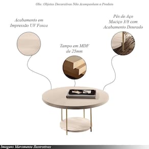 Material da Estrutura: MDF de 25mm e 15mm Peso Suportado: Até 5 Kg distribuídos Pés: Aço Maciço 3/8 Tampo: MDF de 25mm Acabamento: Impressão UV Fosca Conteúdo da Embalagem: 1 Mesa de Centro Acompanha Manual de Montagem: Sim