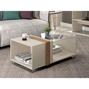 A mesa de centro Núbia é bem-vinda tanto em ambientes empresariais e residências, como recepção e sala de estar. Possui design arrrojado e requintado para abrilhantar o seu ambiente permitindo sobrepor livros, revistas, decoração e muito mais. Composta por tampo com parte em vidro e parte em MDP contendo aplique decorativo em MDF com volumetria. Espaço na parte inferior e nicho lateral. Inclui rodízios de silicone para mais comodidade no dia a dia.